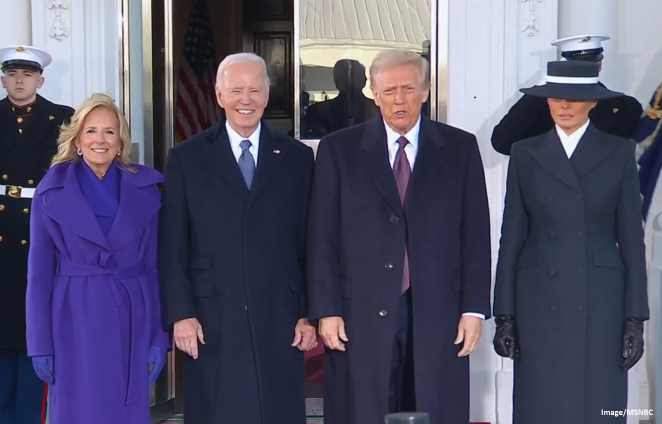 அதிபராகப் பதவியேற்பதற்காக வெள்ளை மாளிகைக்கு தனது மனைவி மெலனியாவுடன் வருகை தந்த டொனால்ட் டிரம்ப்பை, தற்போதைய அதிபர் ஜோ பைடன் தனது மனைவியுடன் வரவேற்று அழைத்துச் சென்றார்.
