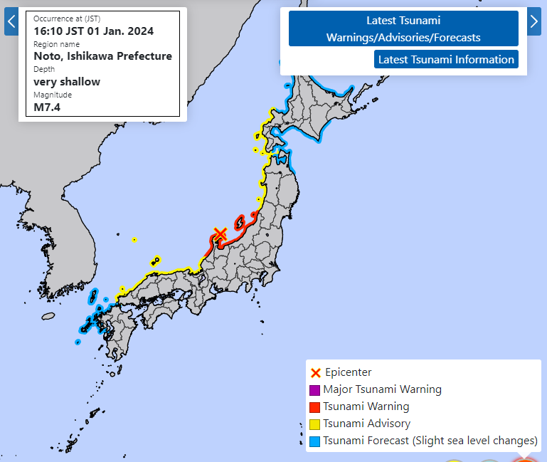 இஷிகாவா பிராந்தியத்தில் உள்ள வஜிமா துறைமுகப் பகுதியில் 1.2 மீட்டர் உயரத்திலான சுனாமி அலைகள் தாக்கி வருவதாக தகவல்கள் வெளியாகியுள்ளன. அதேபோல டோயாமா நகரிலும் சுனாமி அலைகள் தாக்கி வருகின்றன என்று தகவல்கள் தெரிவிக்கின்றன.