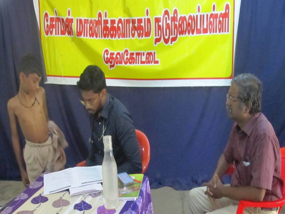 சிவகங்கை மாவட்டம், தேவகோட்டை சேர்மன் மாணிக்க வாசகம் நடுநிலைப் பள்ளியில் மாணவர்களுக்கான மருத்துவ முகாம் நடை பெற்றது. இந்த முகாமிற்கு வந்திருந்தோரை ஆசிரியர் ஸ்ரீதர் வரவேற்றார். தலைமை ஆசிரியர் லெ .சொக்கலிங்கம் தலைமை தாங்கினார்.