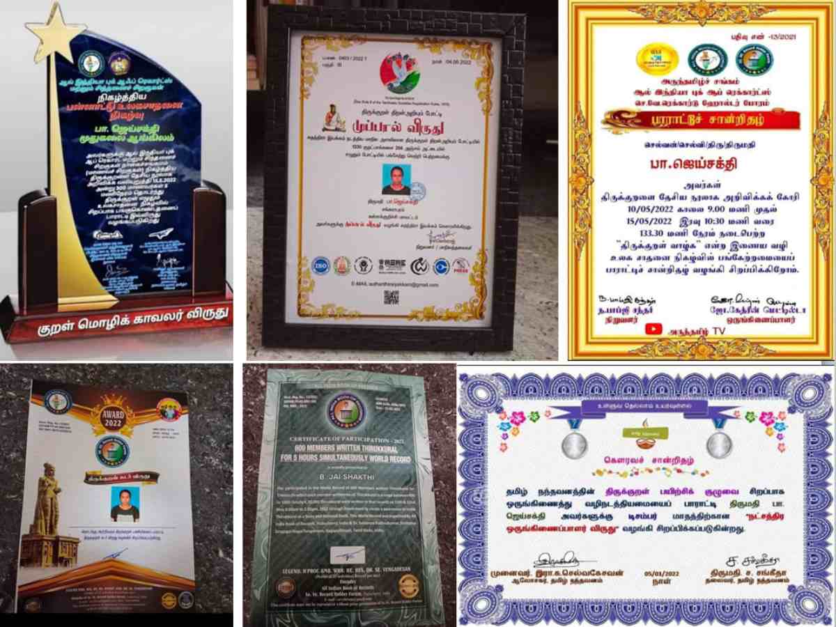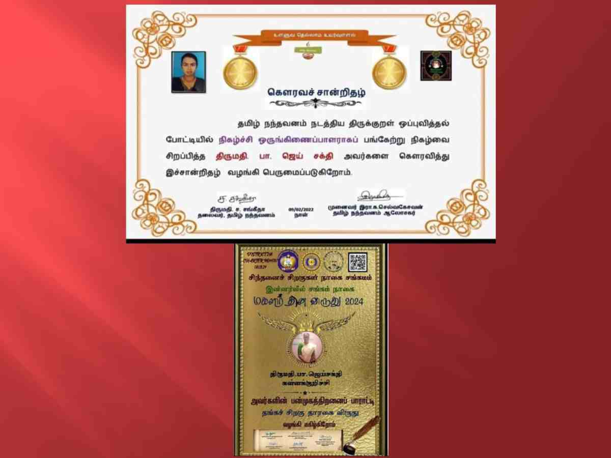 சிந்தனை சிறகுகள் நாகை சங்கமம் மற்றும் இன்னர்வீல் சங்கம் நாகை வழங்கிய மகளிர் தின விருது-2024 வாங்கி உள்ளேன்.இன்னும் சில நிகழ்வுகளில் கலந்து கொண்டு மெடல் மற்றும் சான்றிதழ் பெற்றுள்ளேன்.