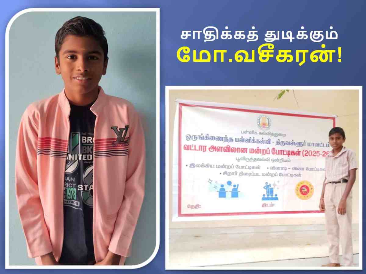 மோ.வசீகரன், கல்வியில் ஒரு துருவ நட்சத்திரமாக ஜொலிக்கிறார். எல்கேஜியிலிருந்தே வகுப்பில் டாப்பர்தான். தற்போது 500-க்கு 490-க்கும் அதிகமான மதிப்பெண்களைப் பெற்று வகுப்பில் முதலிடம் பிடித்துள்ள இவர், தேசிய வருவாய் வழி மற்றும் திறன் படிப்புதவித் தொகைத் தேர்வில் (NMMS 2023-24) 180-க்கு 108 மதிப்பெண்கள் பெற்று சாதனை படைத்துள்ளார். திருவள்ளூர் மாவட்ட அளவில் இத்தேர்வில் தேர்ச்சி பெற்ற இரு மாணவர்களில் மோ.வசீகரன் ஒருவர் என்பது குறிப்பிடத்தக்கது.