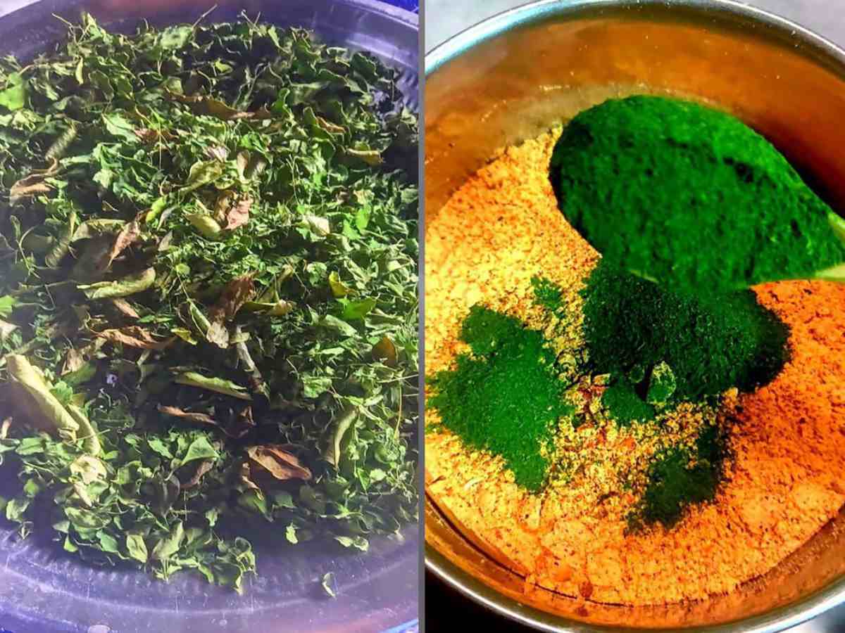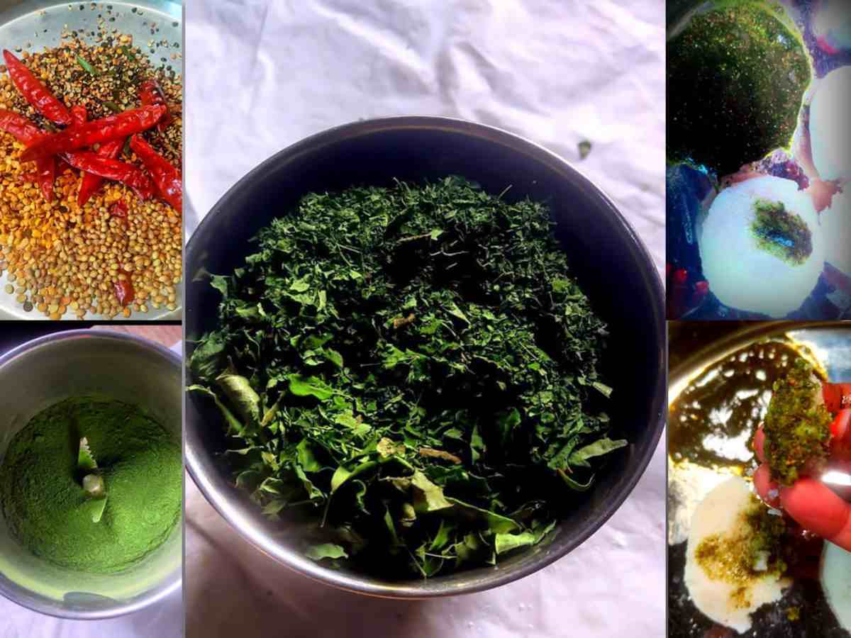 நான்கு ஐந்து நாட்கள் முருங்கைகீரையையும் கருவேப்பிலையையும் நிழலில் காயவைத்து (crispy யா இருக்கும்) அதை மிக்சியில் நன்கு நைசாக அரைத்து கொண்டு.. பிறகு அதில் வறுத்த மற்ற பொருட்களையும் சேர்த்து மிக்சியில் அரைத்தால் சுவையான முருங்கைகீரை இட்லி பொடி தயார்.