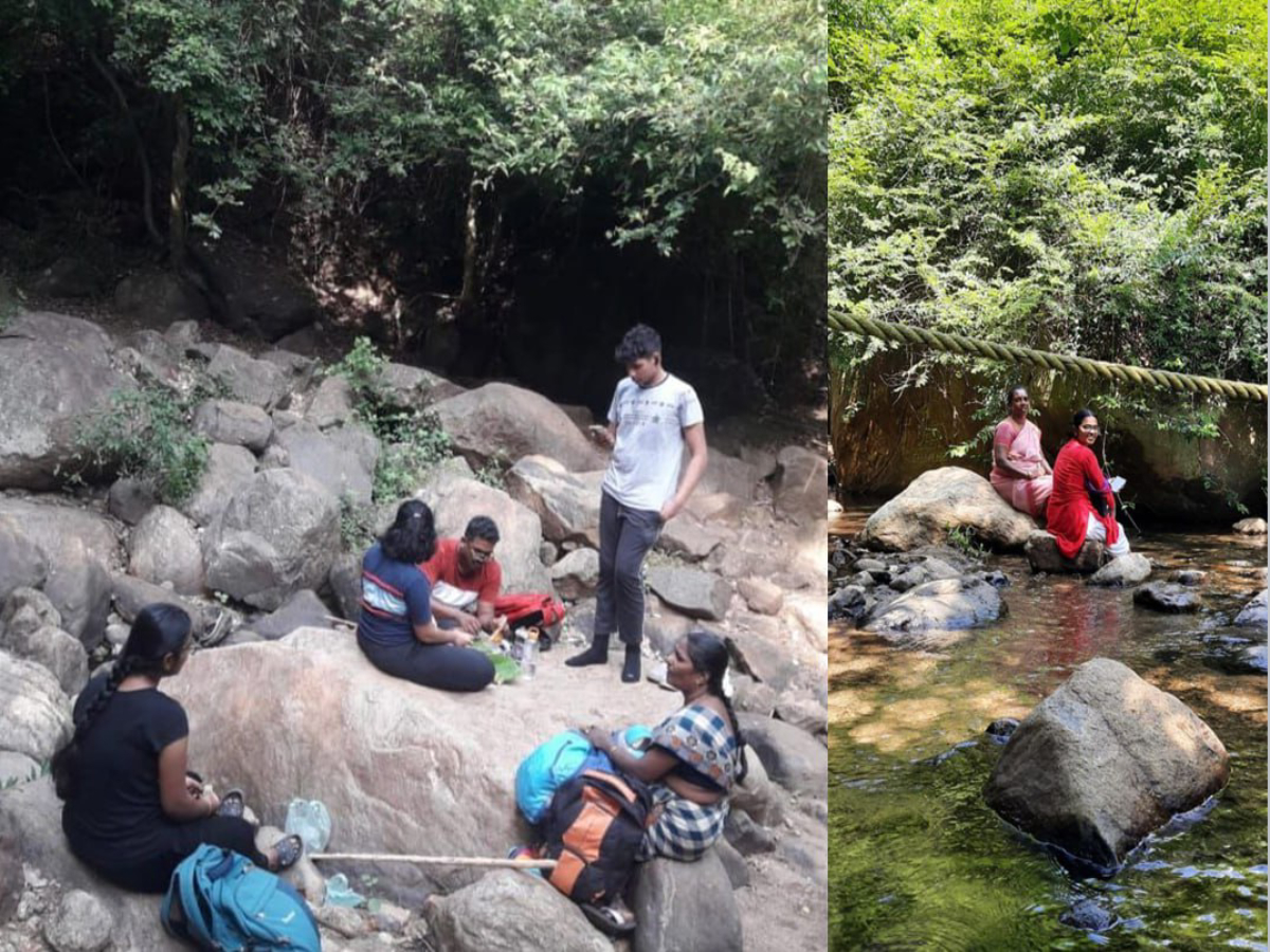 இங்கிருந்து சற்று தூரம் கடந்தால் யார் காலிலும் மிதிபடாமல் ஓடையில் வரும் தண்ணீரை தாகத்திற்கு அருந்தி செல்லலாம். அங்குள்ள பாறைகளில் அமர்ந்து நம் கையில் வைத்துள்ள சாப்பாடு மற்றும் திண்பண்டங்களை சற்று நிம்மதியுடன் சாப்பிட்டு விட்டு செல்லலாம். மேலே செல்ல செல்ல ஆஞ்சநேயரின் தொல்லைகள் அதிகரிக்க தொடங்கிவிடும். அப்பாடா என்ற மனநிம்மதியுடன் மலையேற தொடங்கினால் சங்கிலியுடன் ஒரு பாறை. ஆத்தாடி இது என்ன இம்புட்டு ஒசரமா இருக்கு இதுல எப்பிடி ஏறுறதாம் என குரல்கள் ஒலிக்கும்.