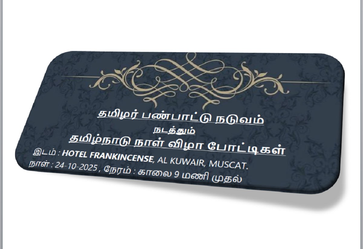மஸ்கட்டில் தமிழர் பண்பாட்டு நடுவம் சார்பில் தமிழ்நாடு நாள் விழா போட்டிகள் அக்டோபர் 24ம் தேதி காலை 9 மணி முதல் நடைபெறவுள்ளன.
