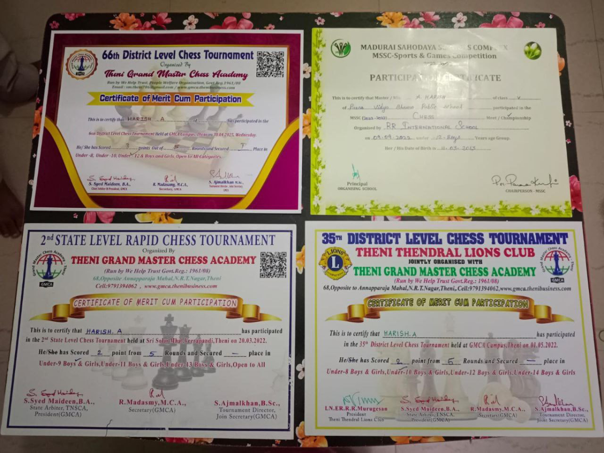 தித்திக்கும் தேனி மாவட்டத்தைச் சேர்ந்தவர்தான் நம்ம ஹரிஸ். 13 வயதாகிறது. அங்குள்ள வேலம்மாள் போதி கேம்பஸ் பள்ளியில் 8ம் வகுப்பு படிக்கிறார். செஸ்ஸில் கில்லியாக இருக்கிறார். எந்தப் போட்டிக்குப் போனாலும் ஜெயிக்காமல் வருவதில்லை. வைத்திருக்கும் சான்றிதழ்கள், பரிசுகளைக் குவித்தால் கிட்டத்தட்ட குட்டி மலை போல வரும் போல. அந்த அளவுக்கு வென்று கொண்டிருக்கிறார்.