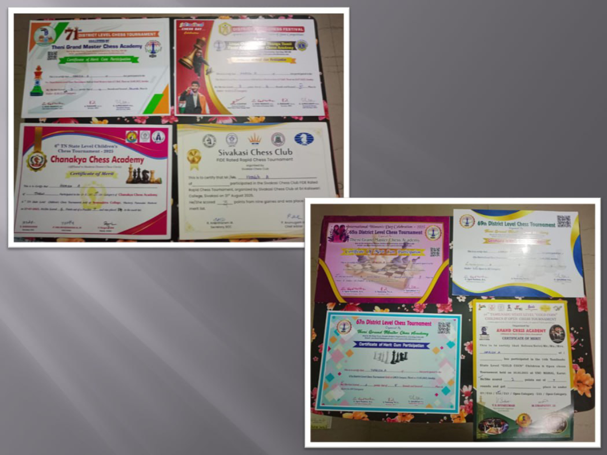 தேனி வீரபாண்டி க்கு சென்று விளையாடினேன். அங்கு ஐந்திற்கு மூன்று என்ற புள்ளி விகிதத்தில் சான்றிதழ் மட்டும் பெற்றுக் கொண்டு வீடு திரும்பினேன். அதன் பிறகு ஒவ்வொரு இடத்திலும் மூன்று என்ற விகிதத்தில் சான்றிதழ் பெற்று வந்தேன். பிறகுதான் இதில் நன்றாக பயிற்சி எடுக்க வேண்டும் என்று தேனியில் உள்ள கிராண்ட் மாஸ்டர் சதுரங்க பயிற்சி வகுப்பில் எனது மாமா சேர்த்துவிட்டார். அதற்கு முன்பு வரை நான் கற்றுக் கொண்டதை வைத்து மட்டும்தான் விளையாடினேன். அதன் பிறகும் தோல்வியை சந்தித்து பிறகு தான் வெற்றி பெற ஆரம்பித்தேன்.