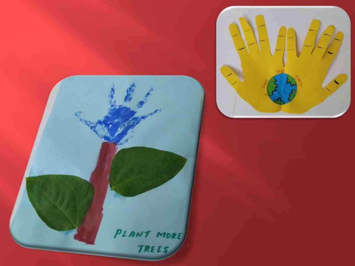 அடுத்து குழந்தைகளின் கை அச்சு (Hand Print) கொண்டு ஒரு அழகான கைவினை உருவாக்கப்பட்டது. வண்ணங்கள் பயன்படுத்தி குழந்தைகளின் கை அச்சுகளை பேப்பரில் பதித்து, அதனை பூமியை பாதுகாக்கும் கைகளாக கற்பனை செய்து உருவாக்கினோம். இது குழந்தைகளுக்கு மிகவும் பிடித்த செயலாக அமைந்தது.
